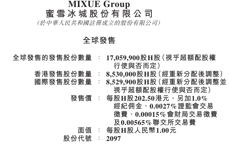蜜雪集团:IPO最终价格为202.5港元/股蜜雪集团:IPO最终价格为202.5港元/股